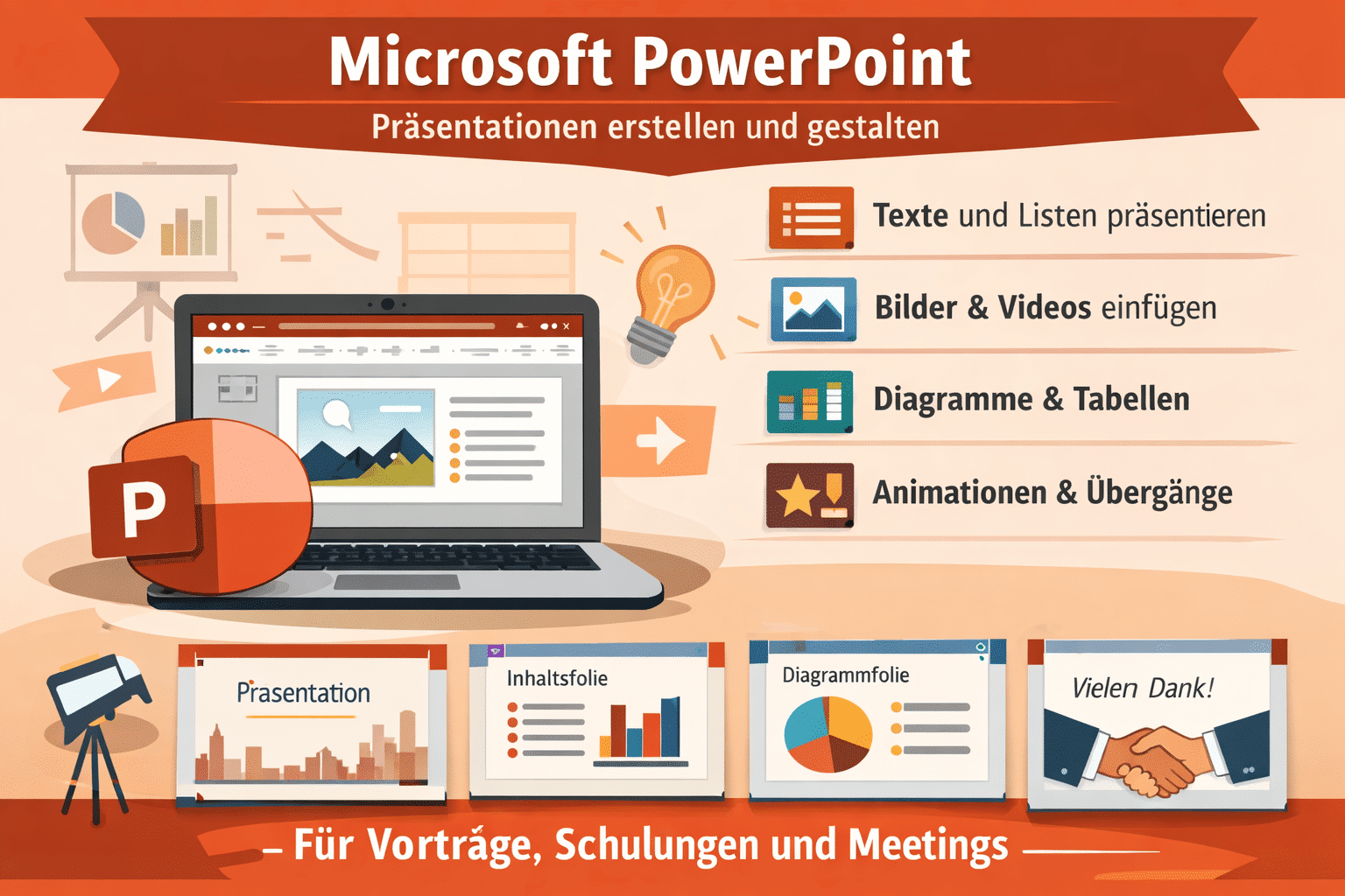 Mit PowerPoint können Sie Inhalte visuell aufbereiten und in Form von Folien präsentieren. Typische Einsatzbereiche sind Vorträge, Schulungen, Besprechungen oder Projektpräsentationen.